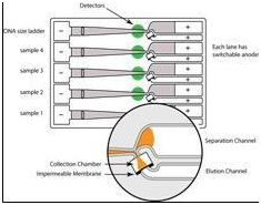 通過(guò)電極切換,打開(kāi)洗提泳道,使目標(biāo)片段進(jìn)入洗提通道的回收室中,從而實(shí)現(xiàn)回收。然后電極再次切換,洗提泳道關(guān)閉,剩余的DNA分子進(jìn)入原先的分離泳道(separation channel)。