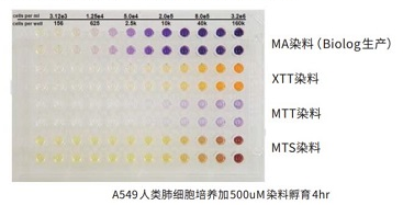 BIOLOG專(zhuān)利開(kāi)發(fā)的MA/MB/MC染料,與傳統(tǒng)的細(xì)胞染料XTT、MTT和MTS相比,具有背景顏色干擾小、靈敏度更高、線性范圍更寬等特點(diǎn),是PMM平臺(tái)最核心技術(shù)之一。
